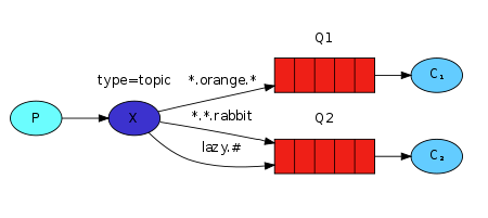 topic exchange根据消息路由键与用于将队列绑定到交换器的模式之间的匹配,将消息路由到一个或多个队列。